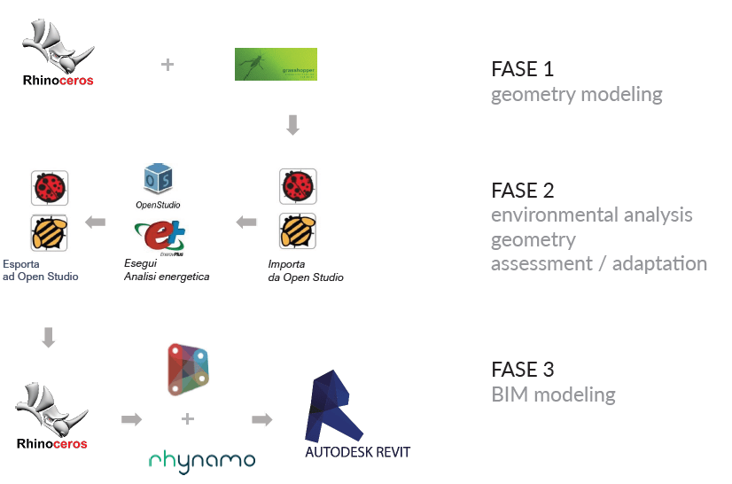 Once completed the first phase of geometric modeling follows a preliminary energy modeling of the building with the tools use of Honeybee & Ladybud, which connects the model to the Open Studio / Energy Plus / Radiance platforms.