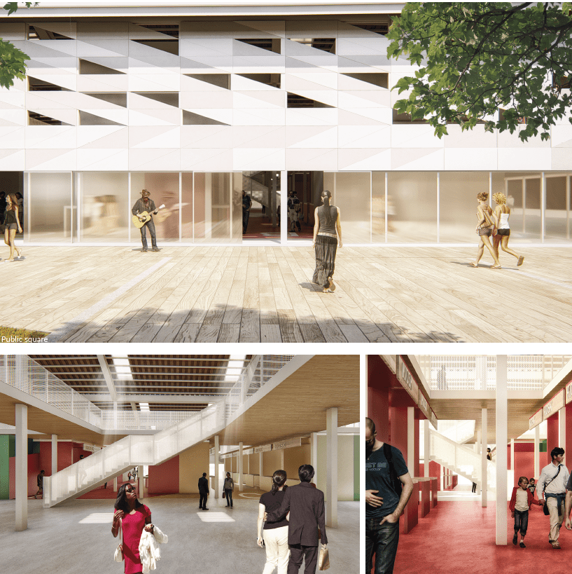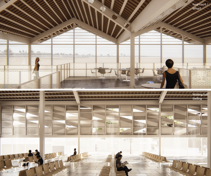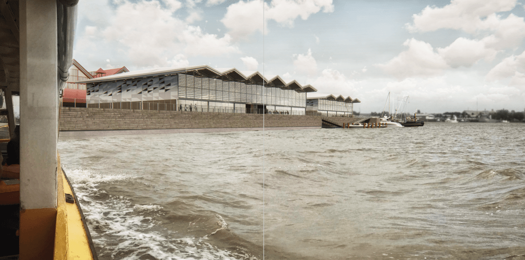 The concept for the Wharf and the Stelling draws inspiration from the architectural typology of the historic market and reinterprets it in a contemporary language, in which the symmetrical divisions of the existing pitched roof follow a sinuous pattern, as if tracing the flow of the river upon which they overlook.